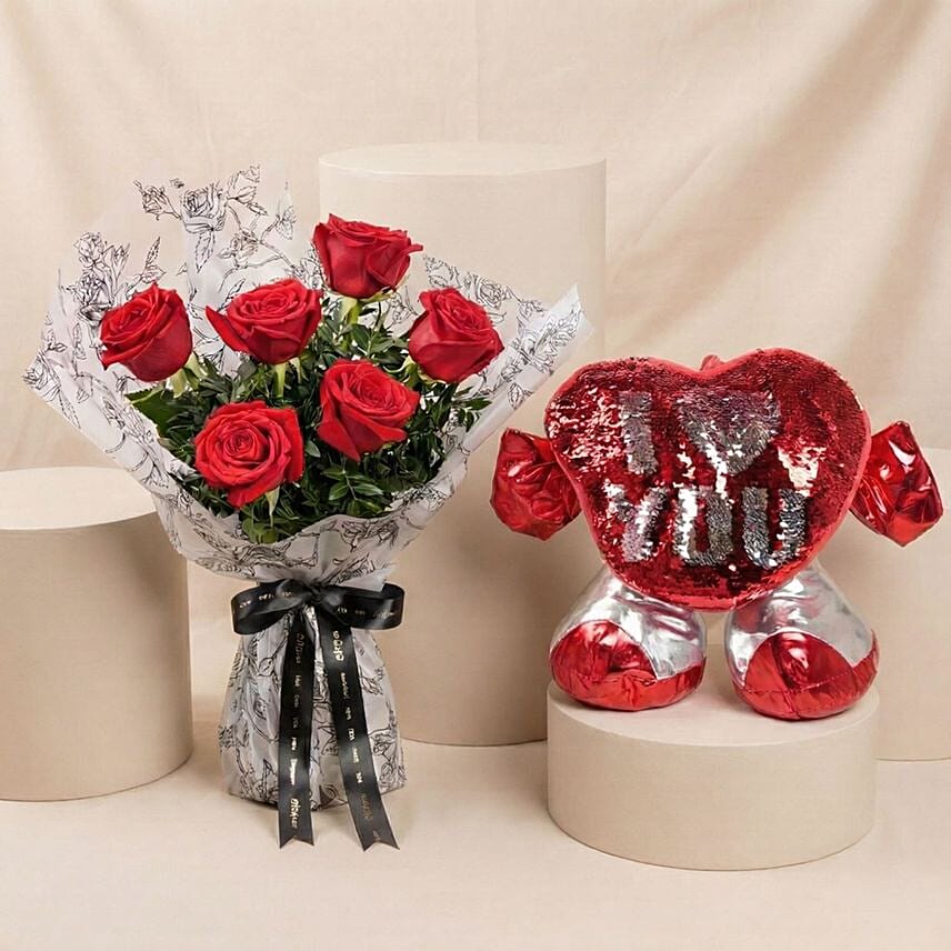 A timeless Valentine’s surprise that blends classic romance with a playful twist, this stunning arrangement pairs velvety red roses with an adorable hugging heart cushion to express love in the most heartfelt way.