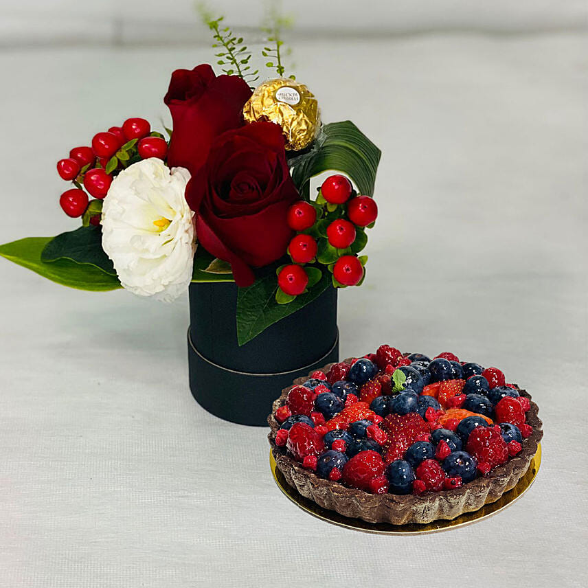 Box Of Roses With Berry Tart Cake