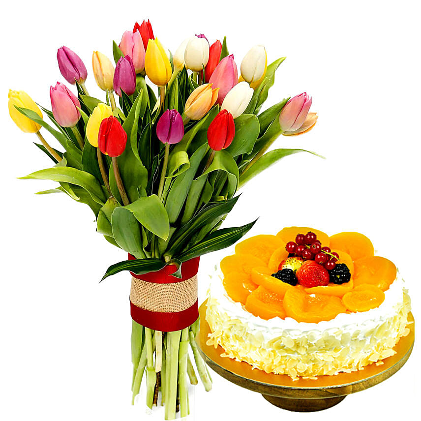 Colourful Tulips Bunch And Chocolate Cake