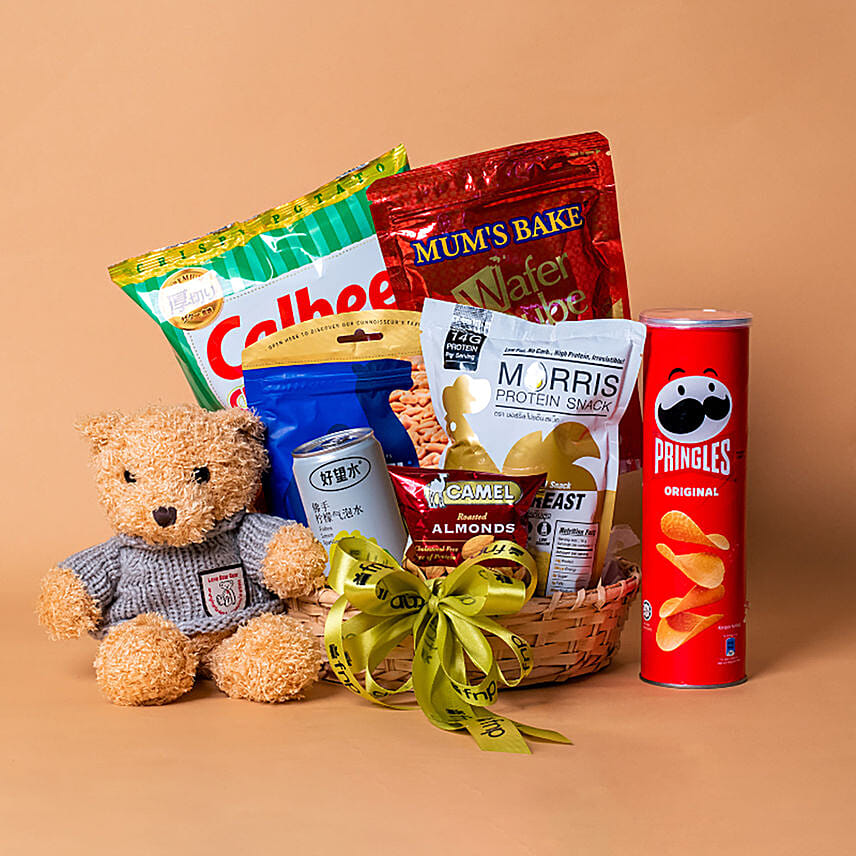 Delightful Treat In Willow Basket With Teddy