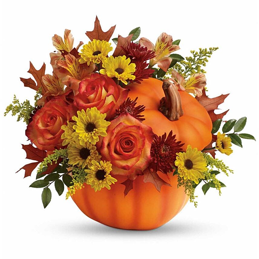 • Small orange pumpkin with fresh flowers