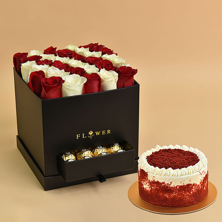 Floral Roses with Chocolates For Valentine And Red Velvet Cake
