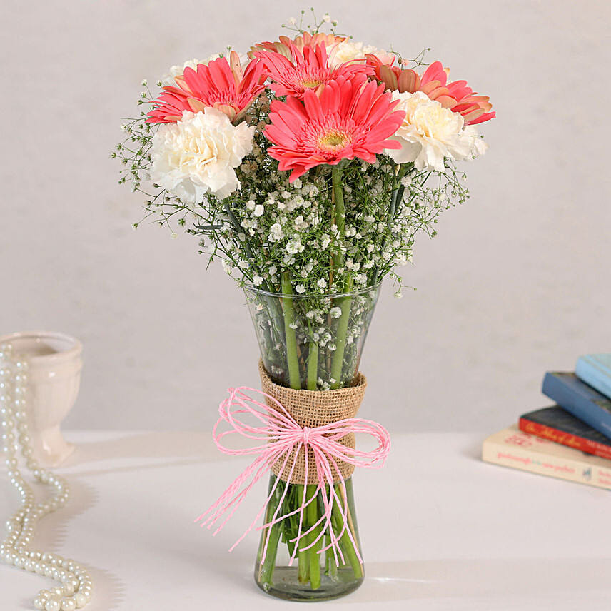 Gerberas White Carnations In Glass Vase