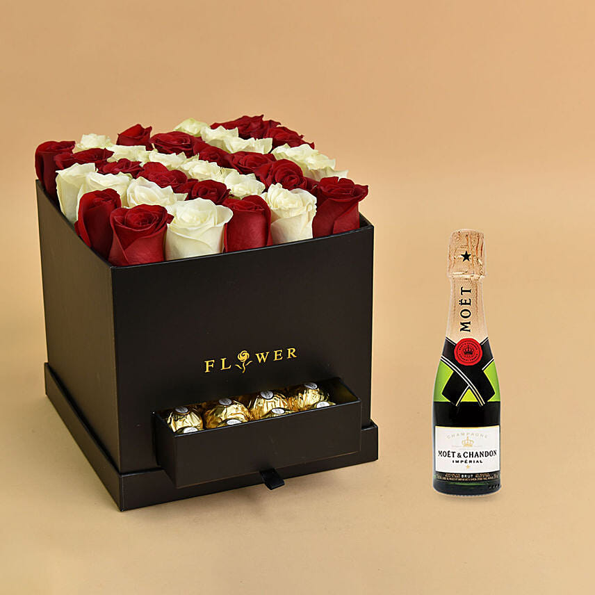 Love Floral Roses with Chocolates For Valentine And Moet Champagne