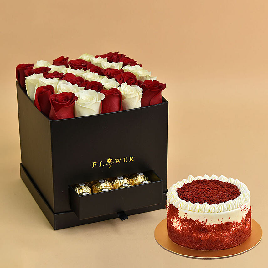 Love Floral Roses with Chocolates For Valentine And Red Velvet Cake