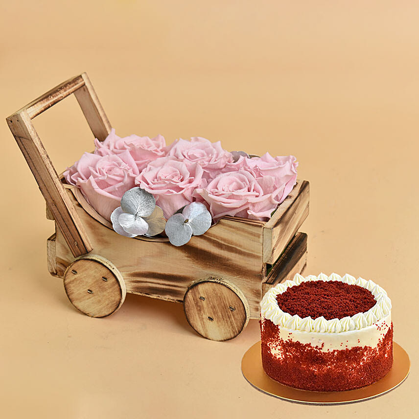 Lovely Forever Roses In a Cart For Valentine With Red Velvet Cake