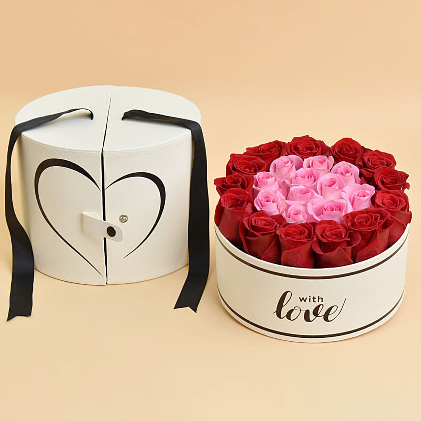 Pink & Red Roses In White Love Box For Valentine