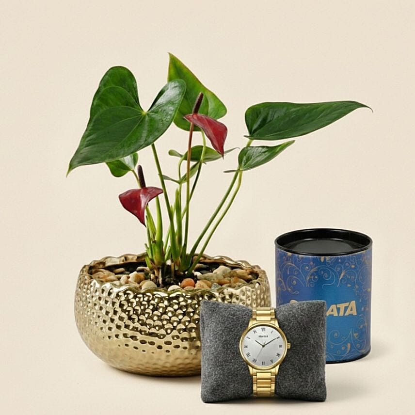 A refined fusion of greenery and timeless style, this premium gift set pairs a vibrant anthurium plant with a classic men’s watch-perfect for expressing admiration and lasting affection.
