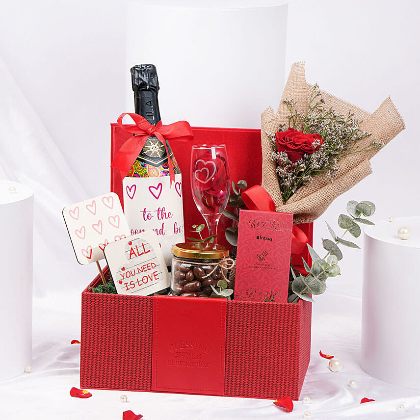 Celebrate love and romance this Valentine’s Day with our Valentine’s Day Sula Wine & Red Rose Bouquet Gift Set. This premium gift set includes a bottle of Sula wine, paired with a beautifully crafted wine glass engraved with hearts, perfect for toasting to love. A stunning red forever rose bouquet with limonium adds a romantic touch, while the "Love" themed coasters and chocolate-coated nuts bring sweetness and joy. The set also features a chocolate bar, a small glass jar, and eucalyptus, all elegantly presented in a premium red box.