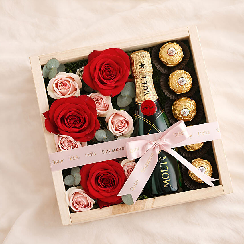 Indulge in a luxurious expression of love with the Roses, Rochers and Moët Mini Gift Box, a beautifully curated arrangement that blends romance, sweetness, and celebration in one elegant keepsake.