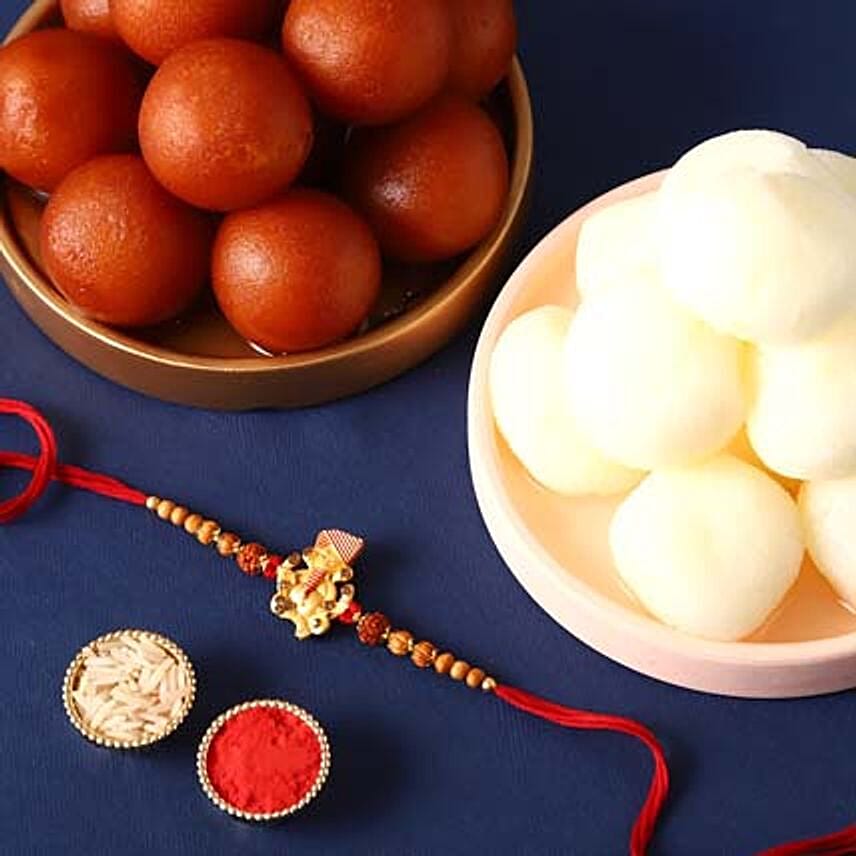 • A minimal style Ganesha rakhi to guide you in making better choices and paves way for growth and prosperity. It also features rudraksha, which is believed to have healing powers. The heavenly rasgullas and gulab jamuns will enhance the festive mood by infusing sweetness to the celebration.