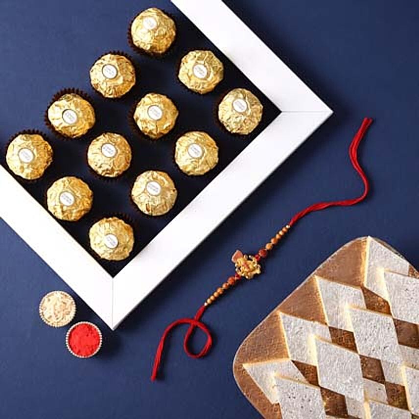 • A minimal style Ganesha rakhi to guide you in making better choices and paves way for growth and prosperity. It also features rudraksha, which is believed to have healing powers. The added kaju katli and Ferrero Rocher chocolates will build on the extra sweetness of the rakhi celebration.