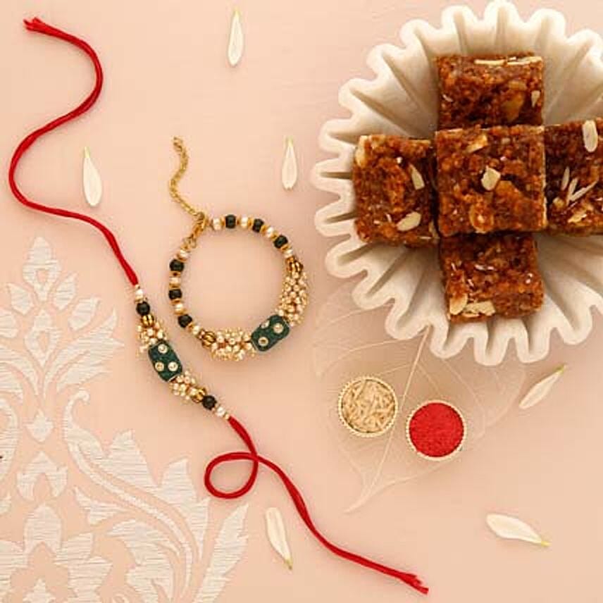 • Ethnic Bhaiya Bhabhi rakhi set that features beads and pearls, beautifully blended together to create an artful set. The bracelet style Bhabhi rakhi features cluster of pearls tied together beautifully. With decadent Dodha Burfi which is a treat for your tastebuds, cherish the memories forever.