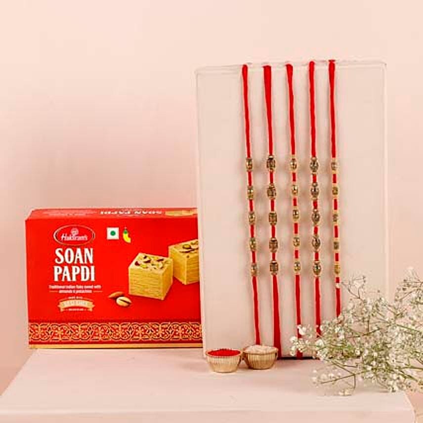 • Elements of brass with intricate designs and Mauli threads for an ethnic look, these rakhis embody the traditional look of Rakshabandhan perfectly. It is accompanied by mouth-watering soan papdi sure to entice the tastebuds.