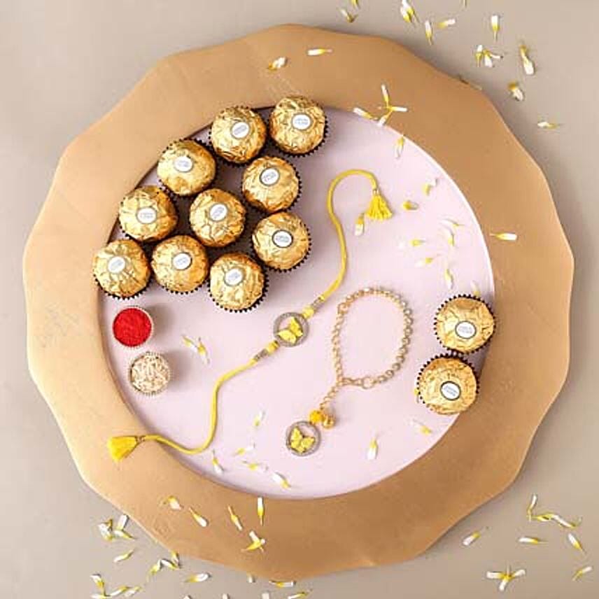 • Butterflies are a symbol of hope and growth, which is perfectly captured by this Bhaiya Bhabhi rakhi set. With soft yellow yarn that ties together the rakhi, it is a simply gorgeous rakhi set. Experience the sweet taste of contrasting layers with Ferrero Rocher chocolates that comes with this special rakhi set.