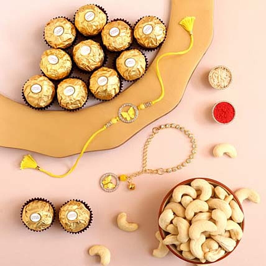• Butterflies are a symbol of hope and growth, which is perfectly captured by this Bhaiya Bhabhi rakhi set. With soft yellow yarn that ties together the rakhi, it is a simply gorgeous rakhi set. It comes with premium Ferrero Rocher chocolates for added sweetness and cashews to aid in blood sugar control and promote heart health.