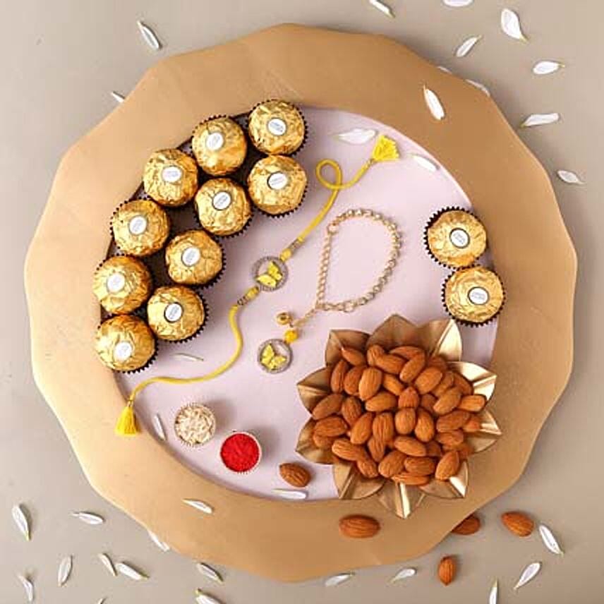 • Butterflies are a symbol of hope and growth, which is perfectly captured by this Bhaiya Bhabhi rakhi set. With soft yellow yarn that ties together the rakhi, it is a simply gorgeous rakhi set. It comes with premium Ferrero Rocher chocolates for added sweetness and almonds for your heart health.