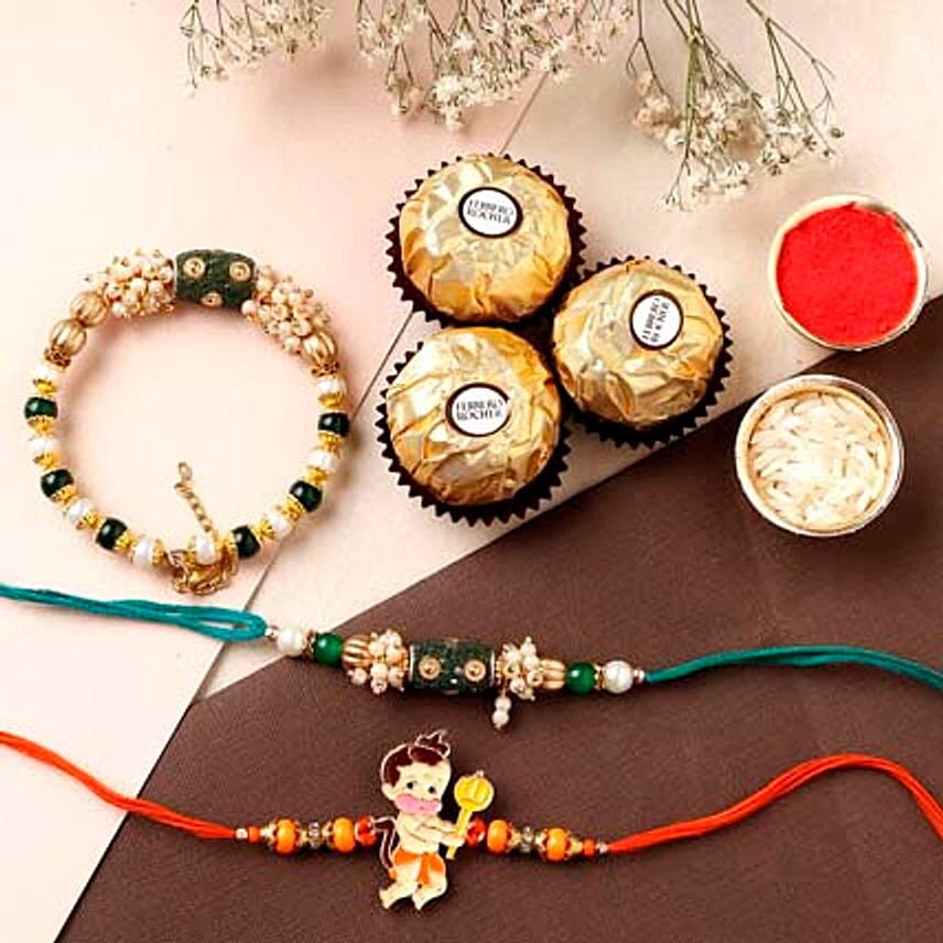 • Ethnic Bhaiya Bhabhi rakhi set that features beads and pearls, beautifully blended together to create an artful set. The family rakhi set is completed with one Bal Hanuman auspicious rakhi for the little one. Experience the sweet taste of contrasting layers with Ferrero Rocher chocolates that comes with this special rakhi set.
