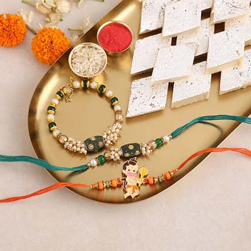 • Ethnic Bhaiya Bhabhi rakhi set that features beads and pearls, beautifully blended together to create an artful set. The family rakhi set is completed with one Bal Hanuman auspicious rakhi for the little one. The added delicious kaju katli will sweeten-up the auspicious occasion.