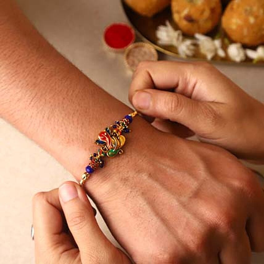 • A holy Ganesha rakhi to guide you in making better choices and paves way for growth and prosperity. The ornate design features colourful clusters of beads in bright tones.