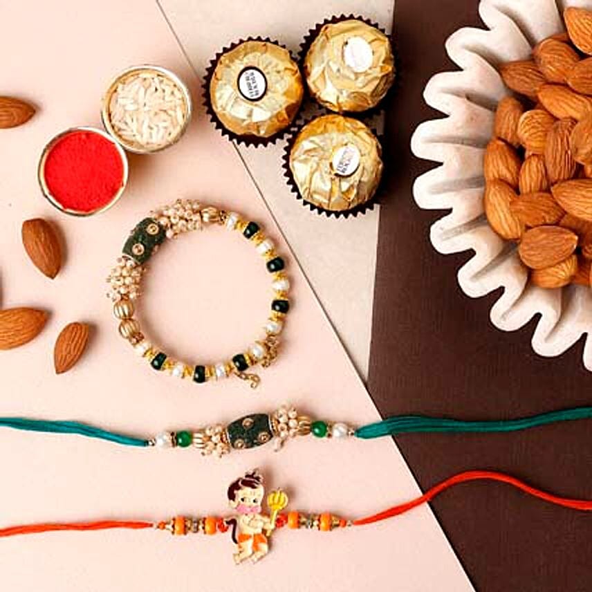 • Ethnic Bhaiya Bhabhi rakhi set that features beads and pearls, beautifully blended together to create an artful set. The family rakhi set is completed with one Bal Hanuman auspicious rakhi for the little one. The rakhi set comes with premium Ferrero Rocher chocolates for added sweetness and almonds for your heart health.
