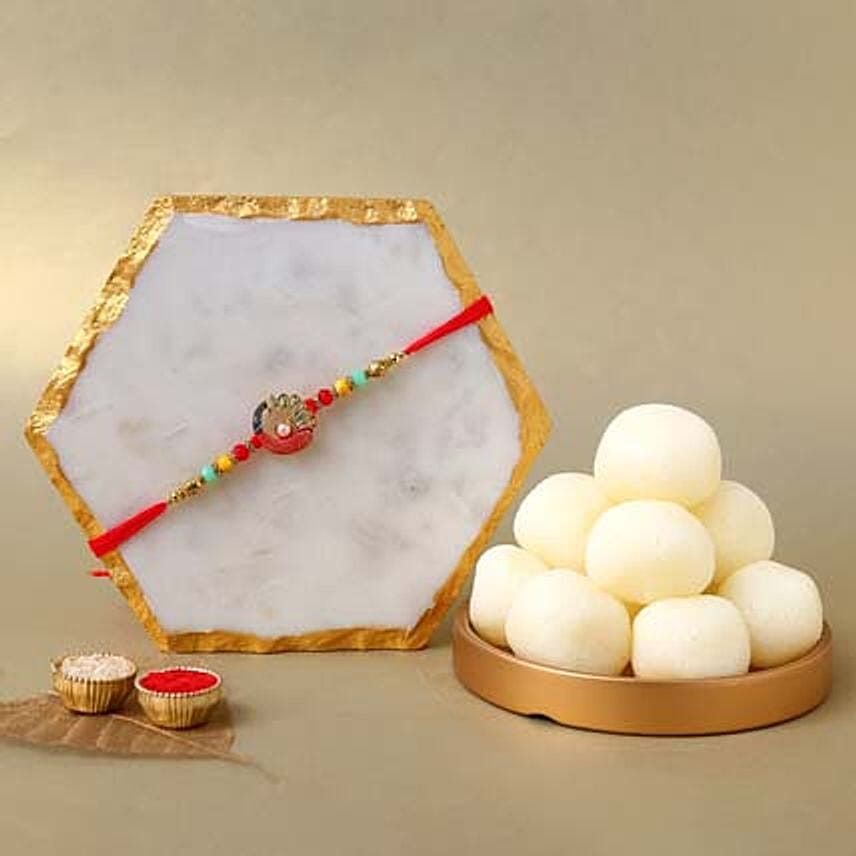 • With colourful pearls surrounding the centerpiece motif, this rakhi reflects the blend of modern with traditional look. It comes with sweetness infused rasgullas that taste heavenly.