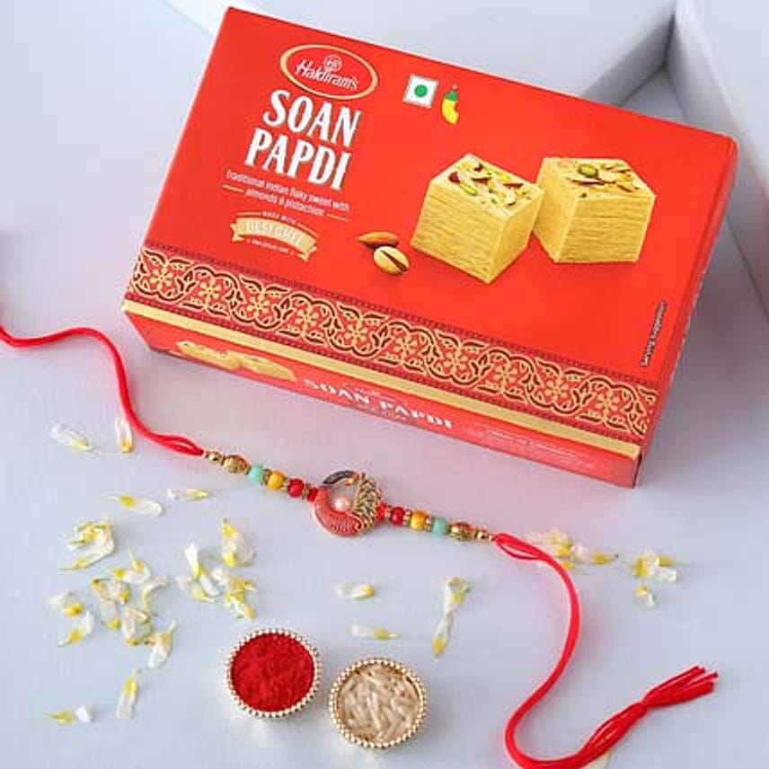 • With colourful pearls surrounding the centerpiece motif, this rakhi reflects the blend of modern with traditional look. It is accompanied by mouth-watering soan papdi sure to entice the tastebuds.