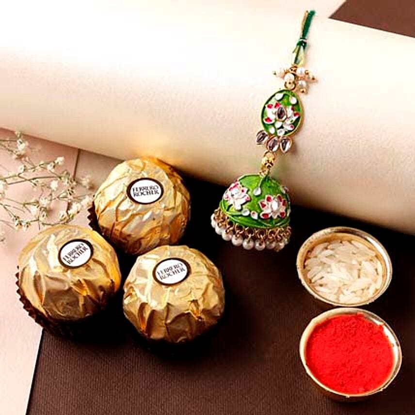 • This magnificent Lumba rakhi reflects the traditional look with lotus design and meenakari work. The beauty of this green Lumba rakhi will add a jewel-like feature to the wrist. Experience the sweet taste of contrasting layers with Ferrero Rocher chocolates that comes with this special rakhi.