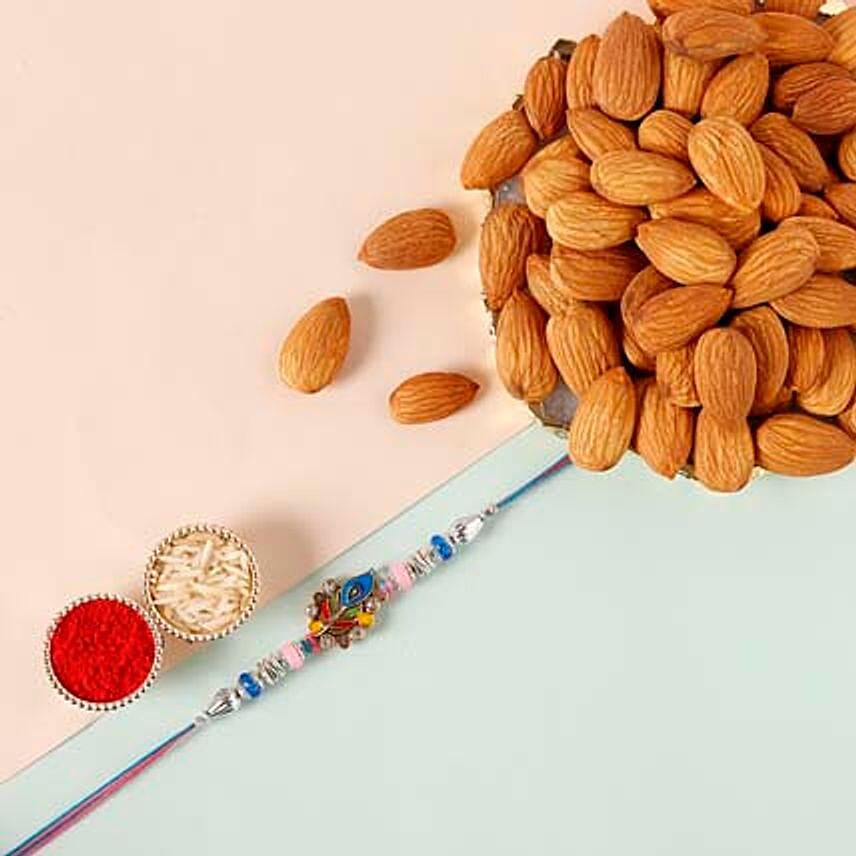 • This sleek rakhi features peacock feather which symbolizes wealth and beauty. Decorated with blue and pink beads with silver elements for an antique touch. Known as the bone-building food and great for your heart, almonds come along with this rakhi.