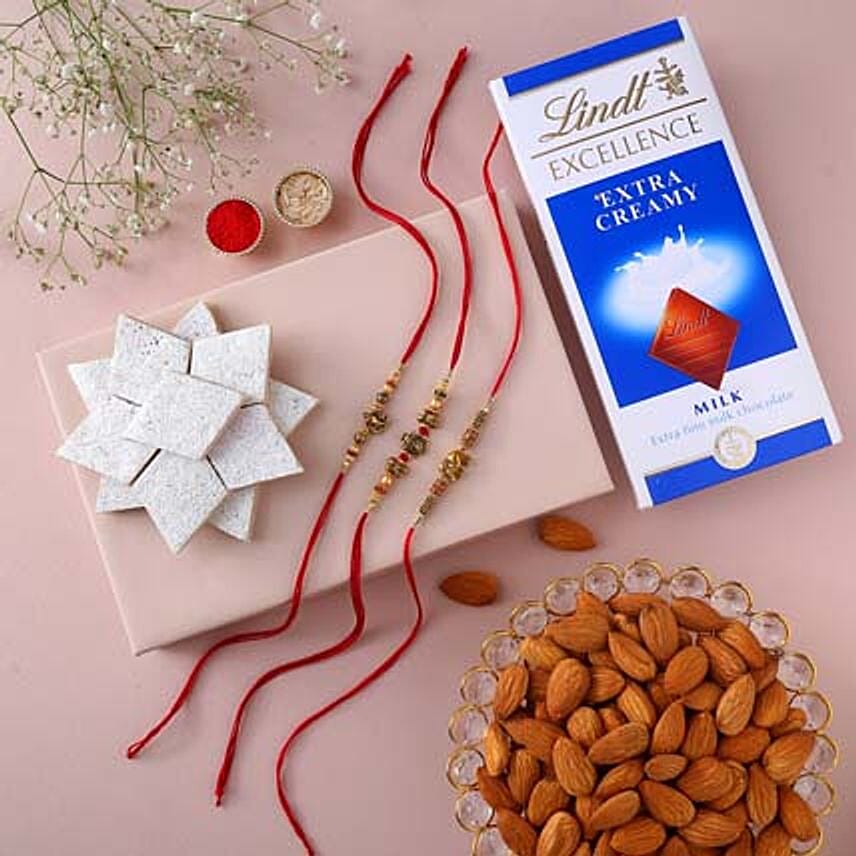 • Feng shui is associated with bringing good fortune and health. This set of three rakhis with feng shui as the centerpiece will bring the blessings of positivity. The rakhi set comes with indulgent sweets, chocolates, and dry fruits for a complete celebratory vibe.