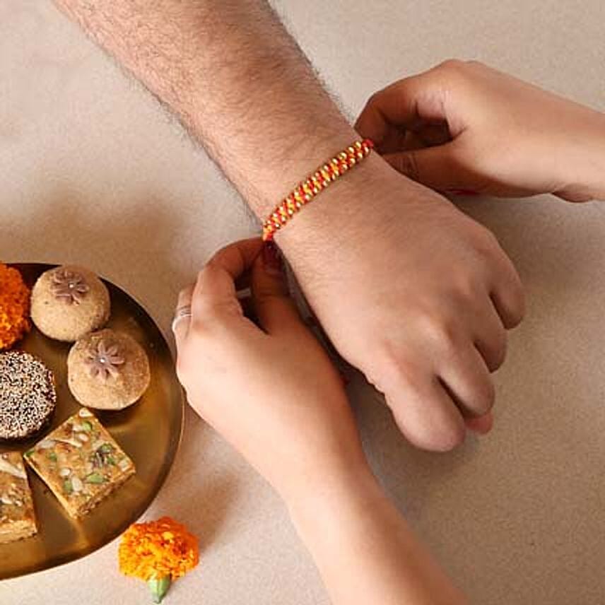 • Big and small beads are stringed together in a symmetrical way for a modern and gorgeous look. The unique tone of peach and purple mixed with golden touch make the rakhis seem exclusive. The rakhi set comes with indulgent sweets, chocolates, and dry fruits for a complete celebratory vibe.