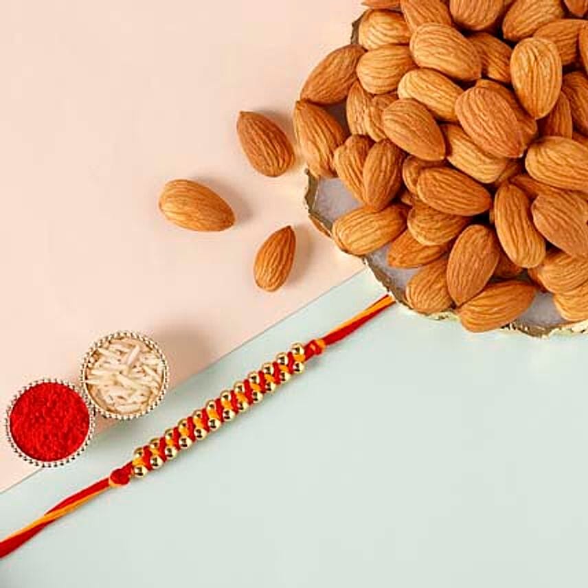 • The simplicity of Mauli rakhi can never go out of style. With the promise of protection and love forever, the little gold beads twisted with Mauli thread add to the overall sleek look of this rakhi. Known as the bone-building food and great for your heart, almonds come along with this rakhi.