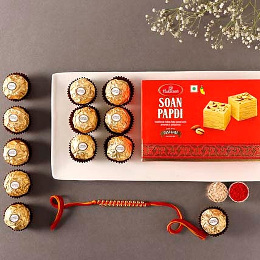 Sneh Elegant Gold Rakhi with Soan Papdi & Ferrero Rocher
