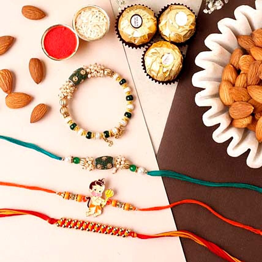 • Features beautiful clusters of beads and pearls to make this artful rakhi for Bhabhi and a simply elegant sleek rakhi for Bhaiya. With the colour of love – red dominating both the rakhis, this rakhi set is perfect for the festive vibes of Rakshabandhan. It comes with an adorable Bal Hanuman rakhi which completes the perfect family set. The rakhi set comes with premium Ferrero Rocher chocolates for added sweetness and almonds for your heart health.