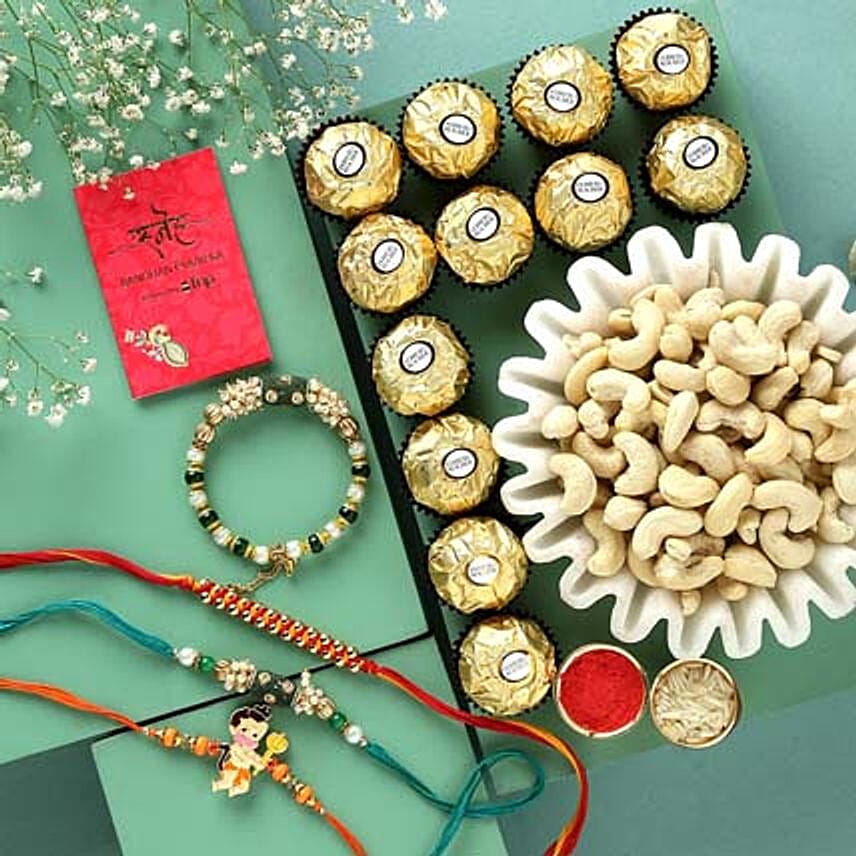 • Features beautiful clusters of beads and pearls to make this artful rakhi for Bhabhi and a simply elegant sleek rakhi for Bhaiya. With the colour of love – red dominating both the rakhis, this rakhi set is perfect for the festive vibes of Rakshabandhan. It comes with an adorable Bal Hanuman rakhi which completes the perfect family set. The rakhi set comes with premium Ferrero Rocher chocolates for added sweetness and cashews to aid in blood sugar control and promote heart health.