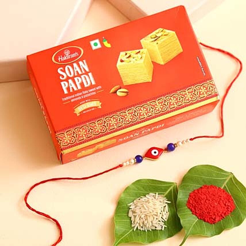 • The power of the evil eye can protect a person from misfortunes and brings good luck. Adorn your brother’s wrist with this talismanic evil eye rakhi to keep negative energy at bay. It is accompanied by mouth-watering soan papdi sure to entice the tastebuds.