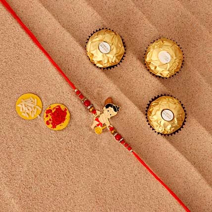 • A cute Ganesha Rakhi for kids to guide them in making better choices and paves way for growth and prosperity. The vibrant colours give it a celebratory look. Experience the sweet taste of contrasting layers with Ferrero Rocher chocolates that comes with this special rakhi.