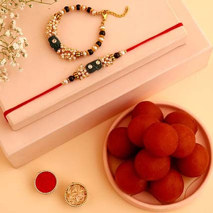 • Ethnic Bhaiya Bhabhi rakhi set that features beads and pearls, beautifully blended together to create an artful set. The bracelet style Bhabhi rakhi features cluster of pearls tied together beautifully. The tempting gulab jamuns accompanying the rakhis will make the festival extra memorable.
