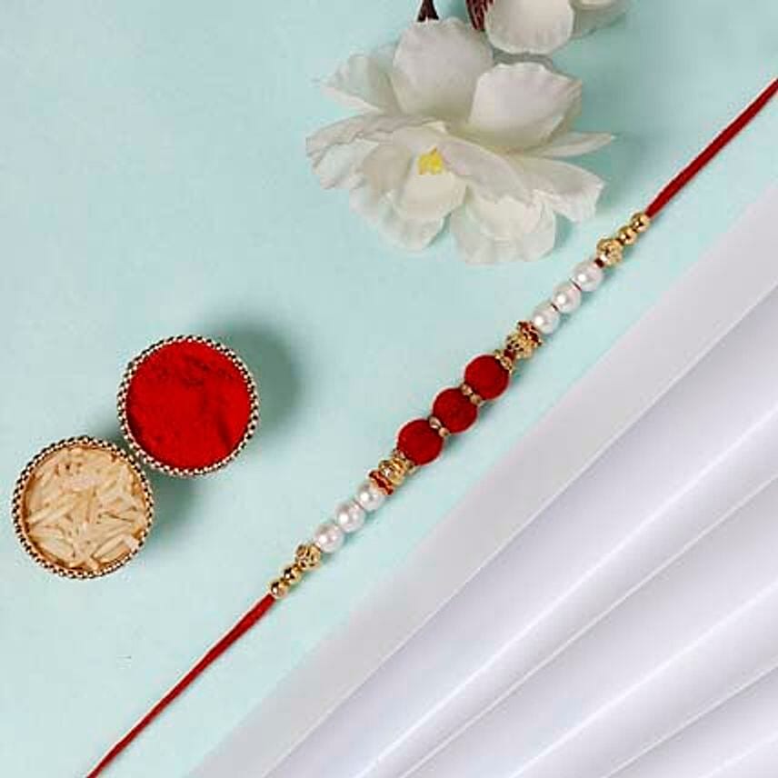 • The beauty of traditions and culture is captured in the essence of this rakhi. The soothing pearls and red beads decorate this intricate rakhi to reflect the unbounded love of the brother and sister relationship.