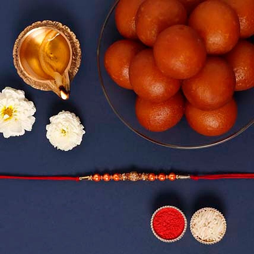 • With trending rose gold coloured beads intertwined together beautifully with brass metal for an embellished rakhi. The red yarn perfectly ties together the designer look. The tempting gulab jamuns accompanying the rakhi will make the festival extra memorable.