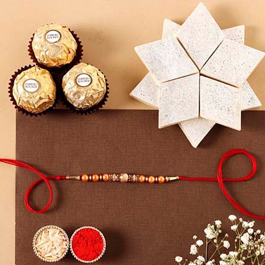• With trending rose gold coloured beads intertwined together beautifully with brass metal for an embellished rakhi. The red yarn perfectly ties together the designer look. The added delicious kaju katli will sweeten-up the auspicious occasion.