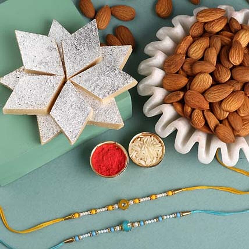• The sleek and designer look of these colourful rakhis will make the moment extra joyous. Yellow brings sunshine, and blue ensures the calmness of the soul. The added kaju katli will sweeten up the occasion while almonds take care of your heart health.