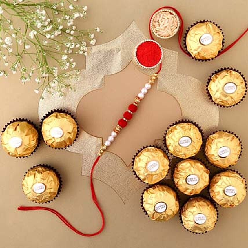 Sneh White Pearl Rakhi & Ferrero Rocher Box