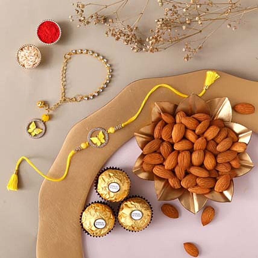 Sneh Yellow Rakhi Set With Almonds & Ferrero Rocher