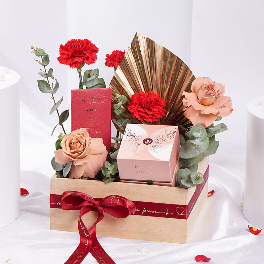 Express your heartfelt emotions with Timeless Bloom & Shine Valentine Hamper, a stunning combination of luxury and elegance. Featuring cappuccino roses, red carnations, and gold-sprayed accents, this exquisite arrangement is paired with the timeless Raga Delight Mother of Pearl Dial Stainless Steel Strap Watch. Beautifully presented in a transparent tray, it’s the perfect gift to make her feel cherished this Valentine’s Day.