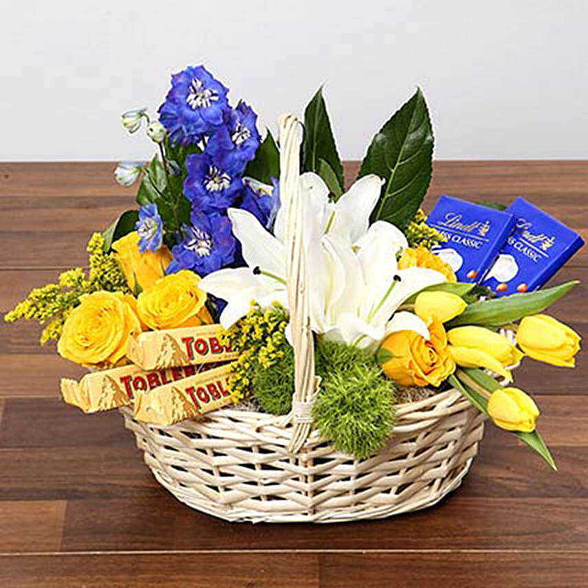 Yellow And Blue Mixed Floral Basket With Chocolates