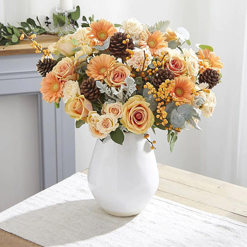 • Lavish roses in peachy oranges are set primly with silvery senecio, eucalyptus, and deep natural pinecones.