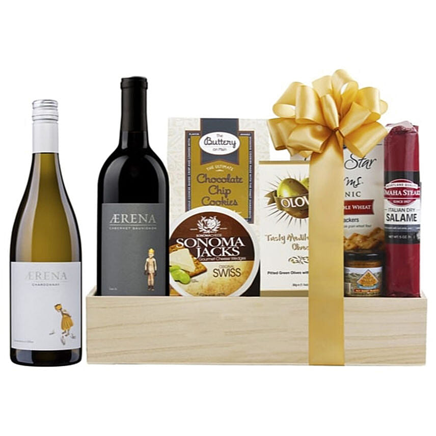 Highly rated Cabernet Sauvignon and Chardonnay are paired perfectly with a beautiful wood crate full of sweet and savory treats such as salame, cheese, crackers, chocolate chip cookies and more. Makes a great gift!