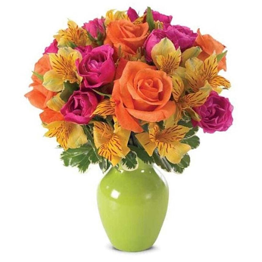 This striking bouquet of pink and orange roses with yellow alstroemeria in a green bud vase will leave her beaming with joy. This Summer colorful bouquet pops with orange roses and other brightly colored floral stems perfect for celebratory occasions.