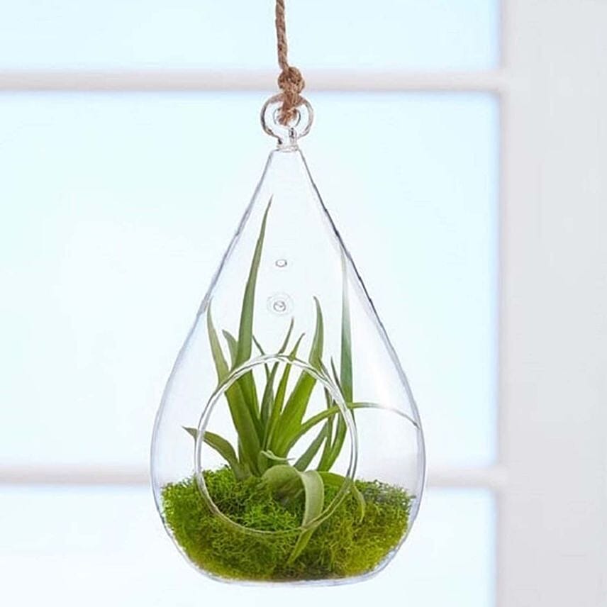 Commonly known as an Airplant, Tillandsia has the ability to grow without being rooted in soil, absorbing water and nutrients through its distinctive leaves. Accented with moss in a unique hanging glass, our terrarium is ideal for adding rare beauty to a den, office or any indoor decor.